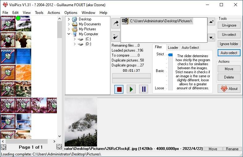 Bien que son interface ne soit pas des plus ordonnées, son utilisation est des plus enfantines. Il vous suffira de sélectionner un ou plusieurs périphériques de stockages et dossiers. Vous n’aurez plus qu’à régler le curseur de critères avant de cliquer sur le bouton » play » pour démarrer. Au terme de la recherche, il affichera les fichiers présentant des similitudes. En survolant chaque image avec le curseur souris, vous serez à même de consulter son emplacement, son poids, sa résolution ainsi que la date de création. Après avoir fait votre tri, vous pourrez les déplacer ou ordonner leur suppression. Plutôt complet, il supporte de nombreux formats d’images : JPG, GIF, PNG, BMP, PCX, TIFF, TGA et . Cerise sur le gâteau, en plus d’être traduite en français cette petite pépite saura tirer partie des processeurs doubles cœur !
